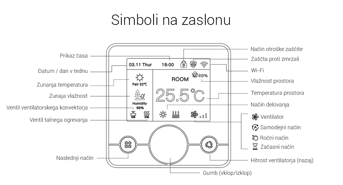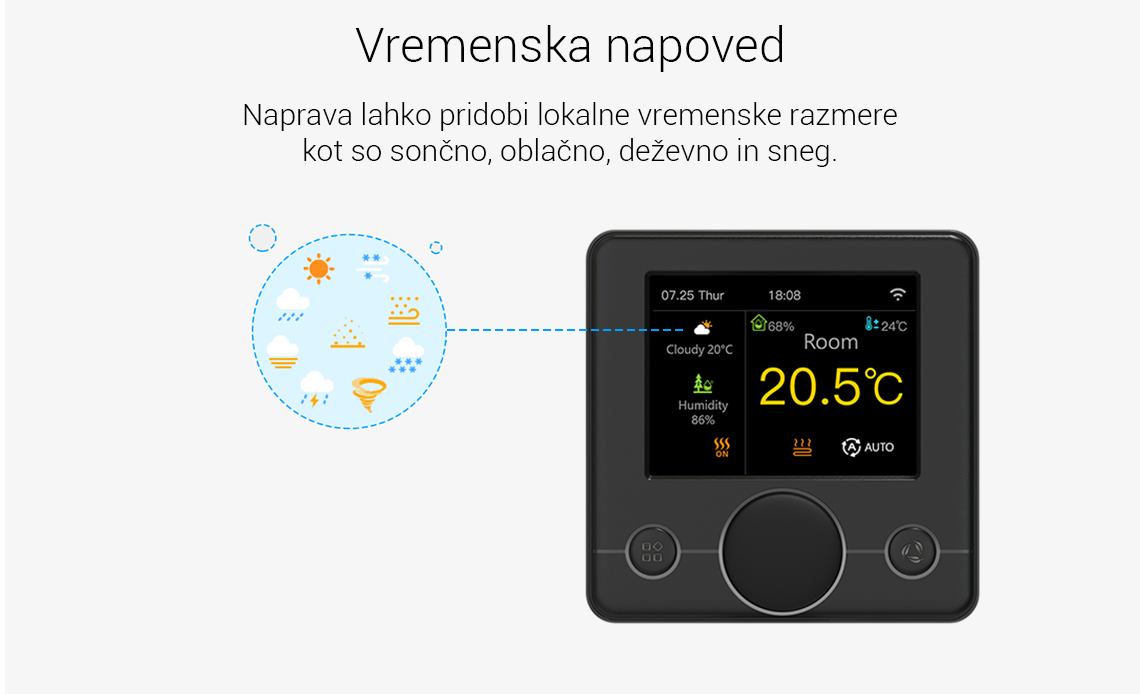 - Prikaz vremena ter stopnje vlažnosti, pri povezavi z Wi-Fijem