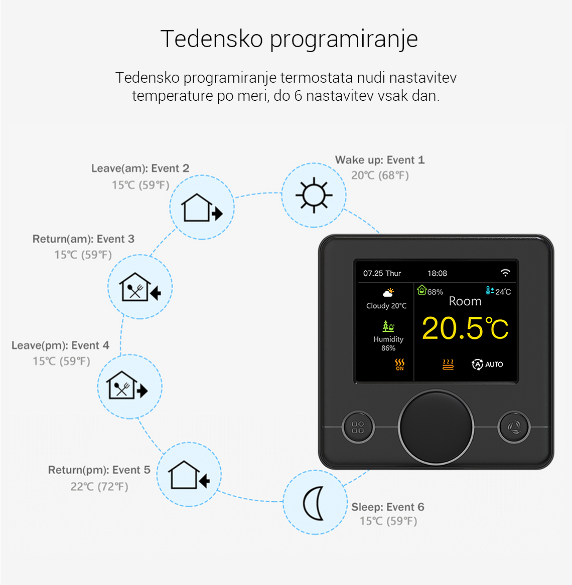 - Tedenski programabilni termostat - do 6 dogodkov lahko nastavite ločeno za vsak dan