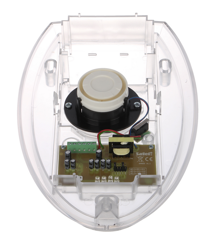 SP-500-R je optično-zvočna sirena, zasnovana za zunanjo namestitev, opremljena z zelo svetlimi LED diodami in piezoelektričnim pretvornikom. Izbirate lahko med tremi 120 dB toni. Ohišje sirene je izdelano iz polikarbonata, kar zagotavlja visoko mehansko trdnost in estetski videz naprave, ki s časom ostane nespremenjena. Preprosta, a privlačna oblika ohišja je idealna tudi za sodobno fasado. Naprava je zaščitena pred posegi pred odpiranjem ali odtrganjem od stene. Elektronska vezja so primerno vremensko zaščitena, zato so odporna tudi na vplive težkih okoljskih razmer.