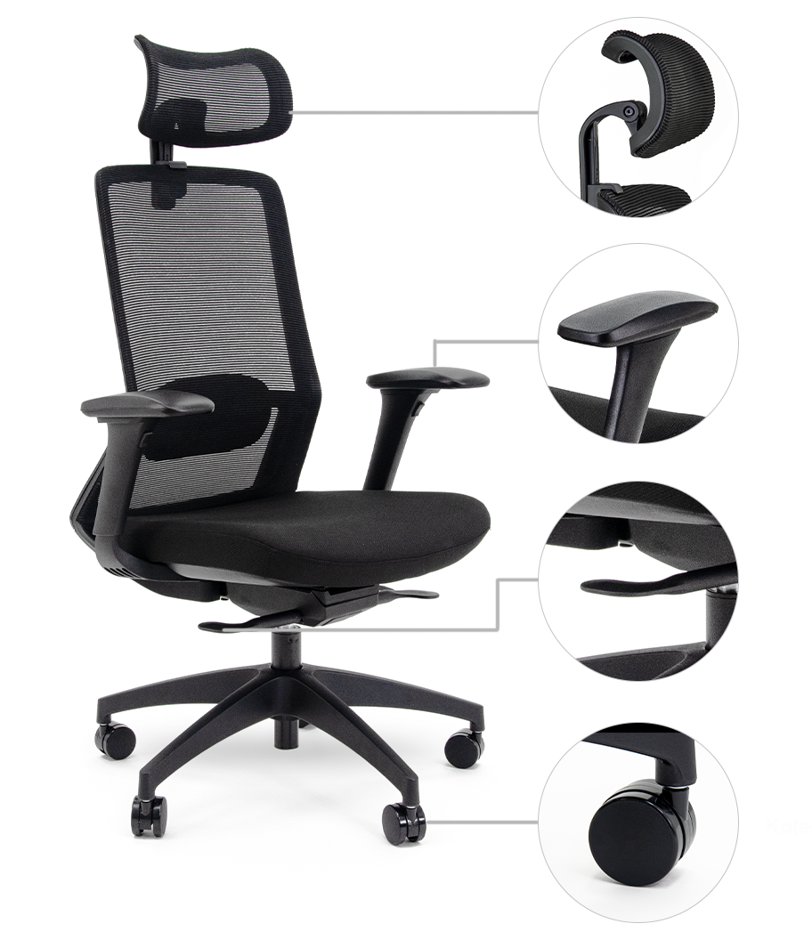 za glavo, izbočena in nastavljiva ledvena opora in 4D nastavljiva naslona za roke.