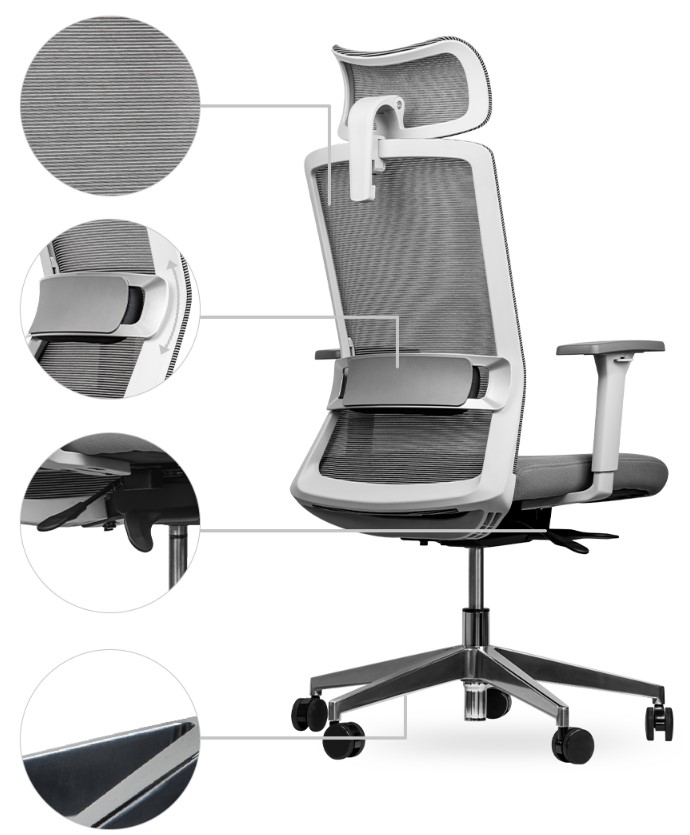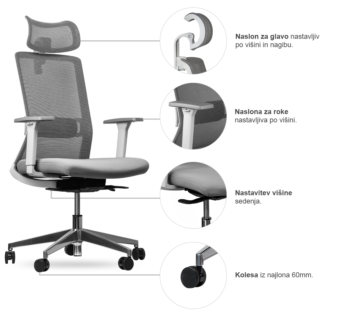 Pisarniški stol ima za vaše udobje višinsko prilagodljiv sedež, naklonsko prilagodljiv hrbtni naslon, višinsko prilagodljiv naslon za glavo, izbočena in nastavljiva ledvena opora in nastavljiva naslona za roke.