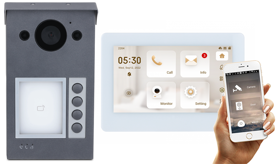 Štiristanovanjska zunanja enota Wi-Fi + 2MP kamera + 7 palčni barvni zaslon na dotik + UTP povezava + odklepanje s kartico, notranjo enoto, preko aplikacije + povezava s kamero + možnost alarma