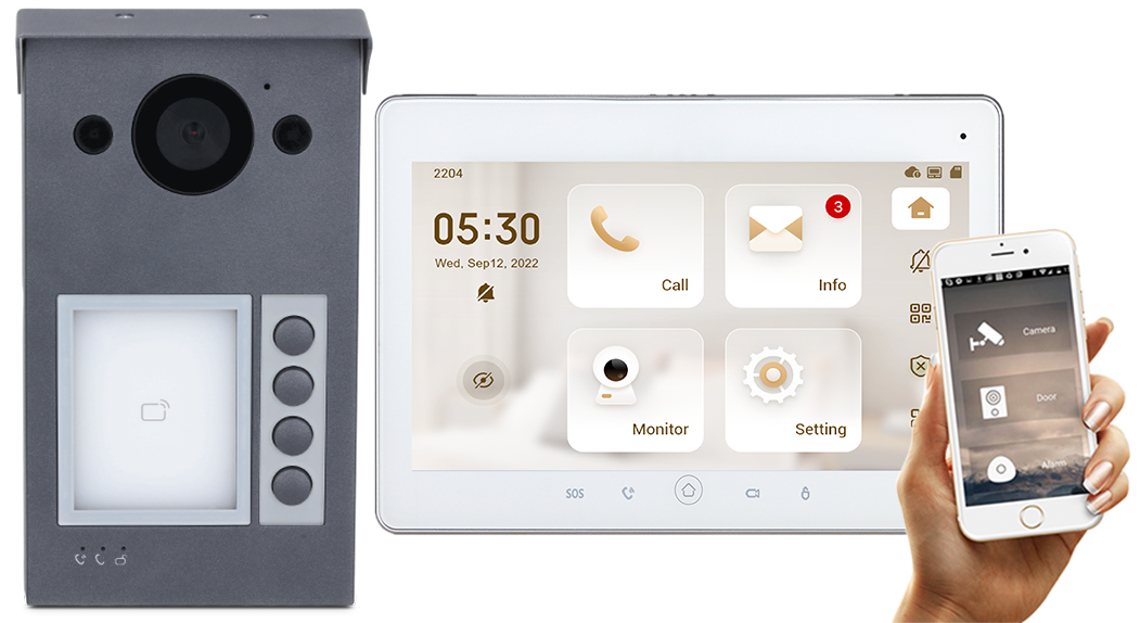 Štiristanovanjska zunanja enota Wi-Fi + 2MP kamera + 10 palčni barvni zaslon na dotik + UTP povezava + odklepanje s kartico, notranjo enoto, preko aplikacije + interkom funkcija + možnost alarma + snemanje in slikanje