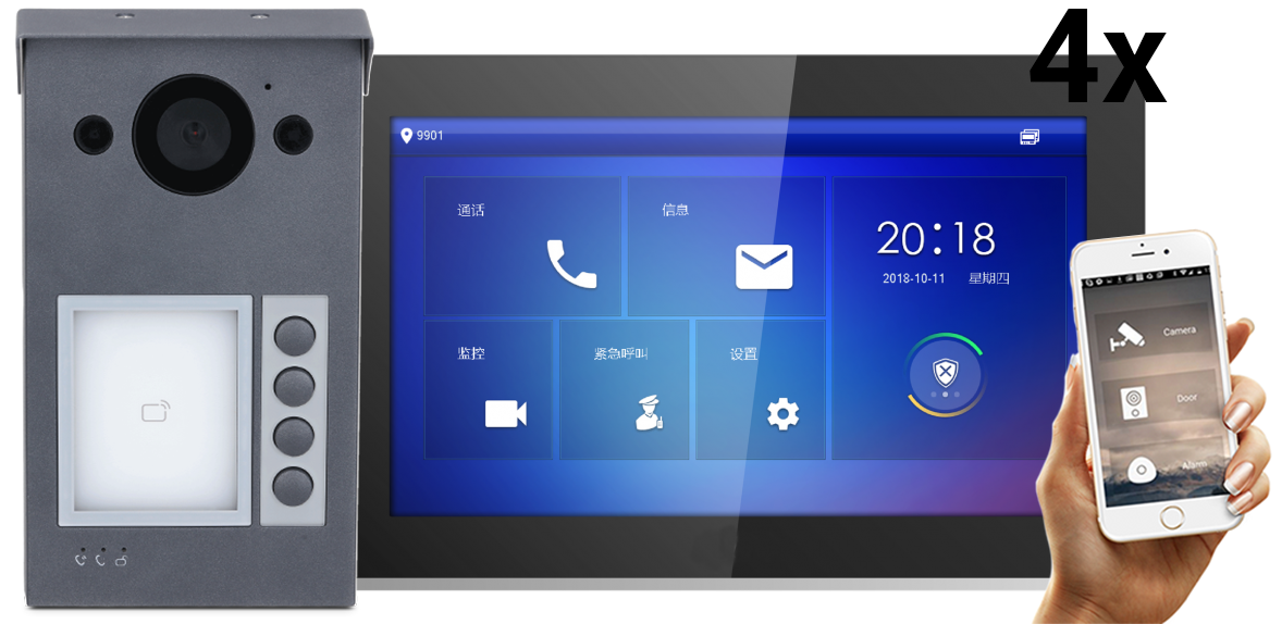 Štiristanovanjska zunanja enota Wi-Fi + 2MP kamera + 10 palčni barvni zaslon na dotik + UTP povezava + odklepanje s kartico, notranjo enoto, preko aplikacije + možnost alarma