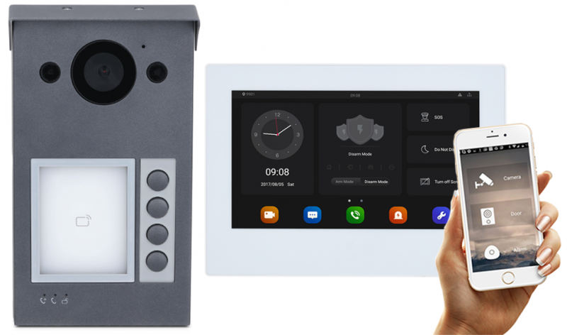 Štiristanovanjska zunanja enota Wi-Fi + 2MP kamera + 7 palčni barvni zaslon na dotik + Android 8.1 + UTP povezava + odklepanje s kartico, notranjo enoto, preko aplikacije + povezava s kamero + možnost alarma