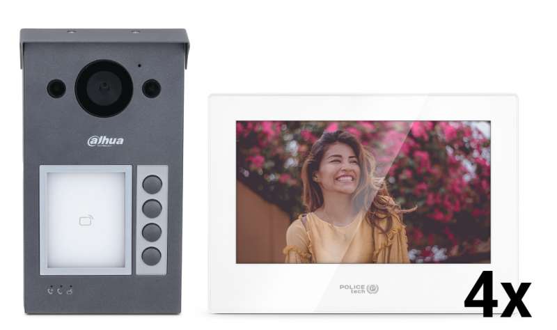 Štiristanovanjska zunanja enota + 2MP kamera + 7 palični barvni zaslon na dotik + UTP povezava + odklepanje s kartico, notranjo enoto, preko aplikacije + povezava s kamero + SOS alarm + Wi-Fi + možnost spomina