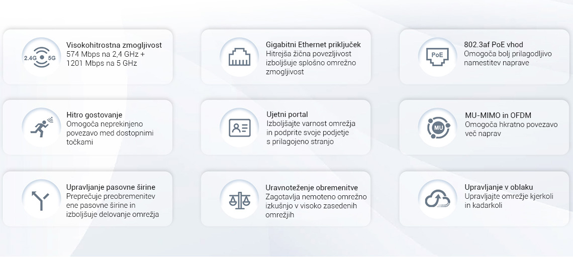 Vmesnik: 2*10/100/1000Mbps; Base-T Ethernet vrata (WAN vrata podpirajo vhod 802.3af PoE)