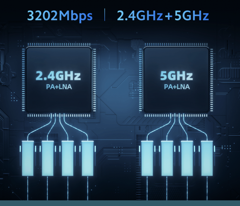 Xiaomi Router AX3200 ponuja 2,4 GHz in 5 GHz. Oba pasova se ne motita drug drugega in imata skupno teoretično brezžično hitrost največ 3202 Mbps. Uživajte v izjemno hitrem dostopu do interneta, stabilni pokritosti s signalom, visoki hitrosti uporabe, neprekinjenih videoposnetkih HD in obsežnem spletnem igranju.