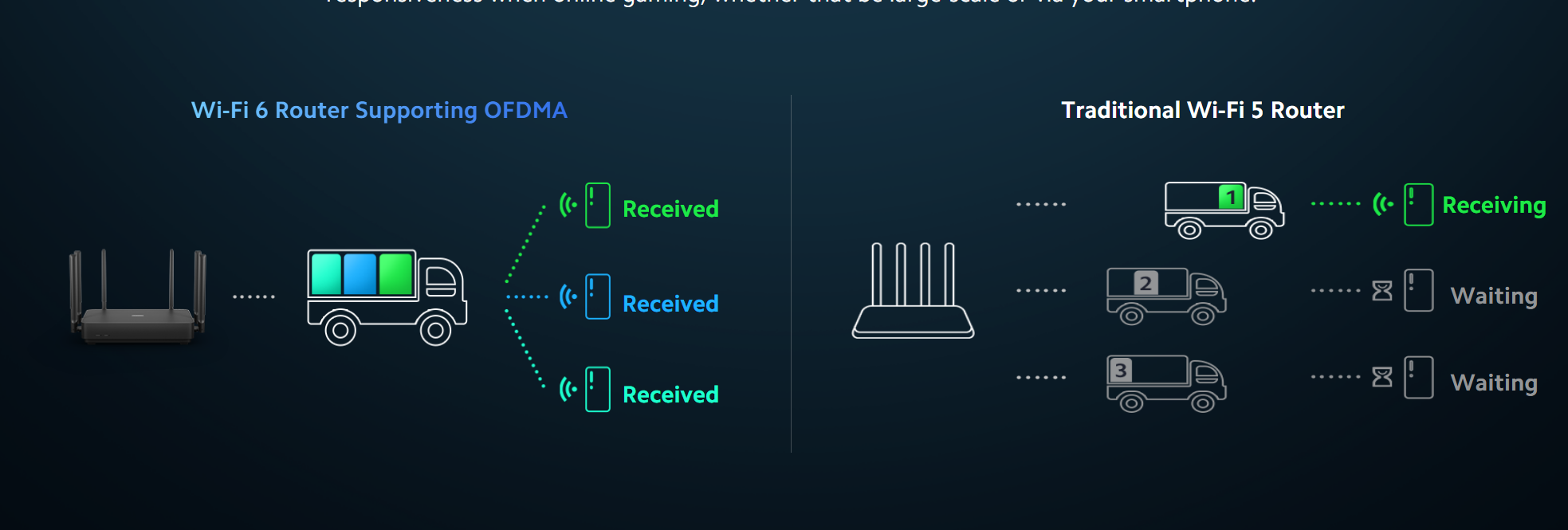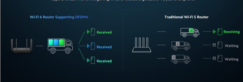 Tehnologija OFDMA omogoča vašemu usmerjevalniku pošiljanje podatkov na več končnih naprav s samo enim prenosom, pri čemer bi tradicionalni usmerjevalnik moral poslati več prenosov. OFDMA omogoča učinkovitejši prenos in zmanjšano zakasnitev, tako da lahko uporabljate več naprav hkrati in uživate v takojšnji odzivnosti pri spletnem igranju iger, ne glede na to, ali je to veliko ali prek pametnega telefona.