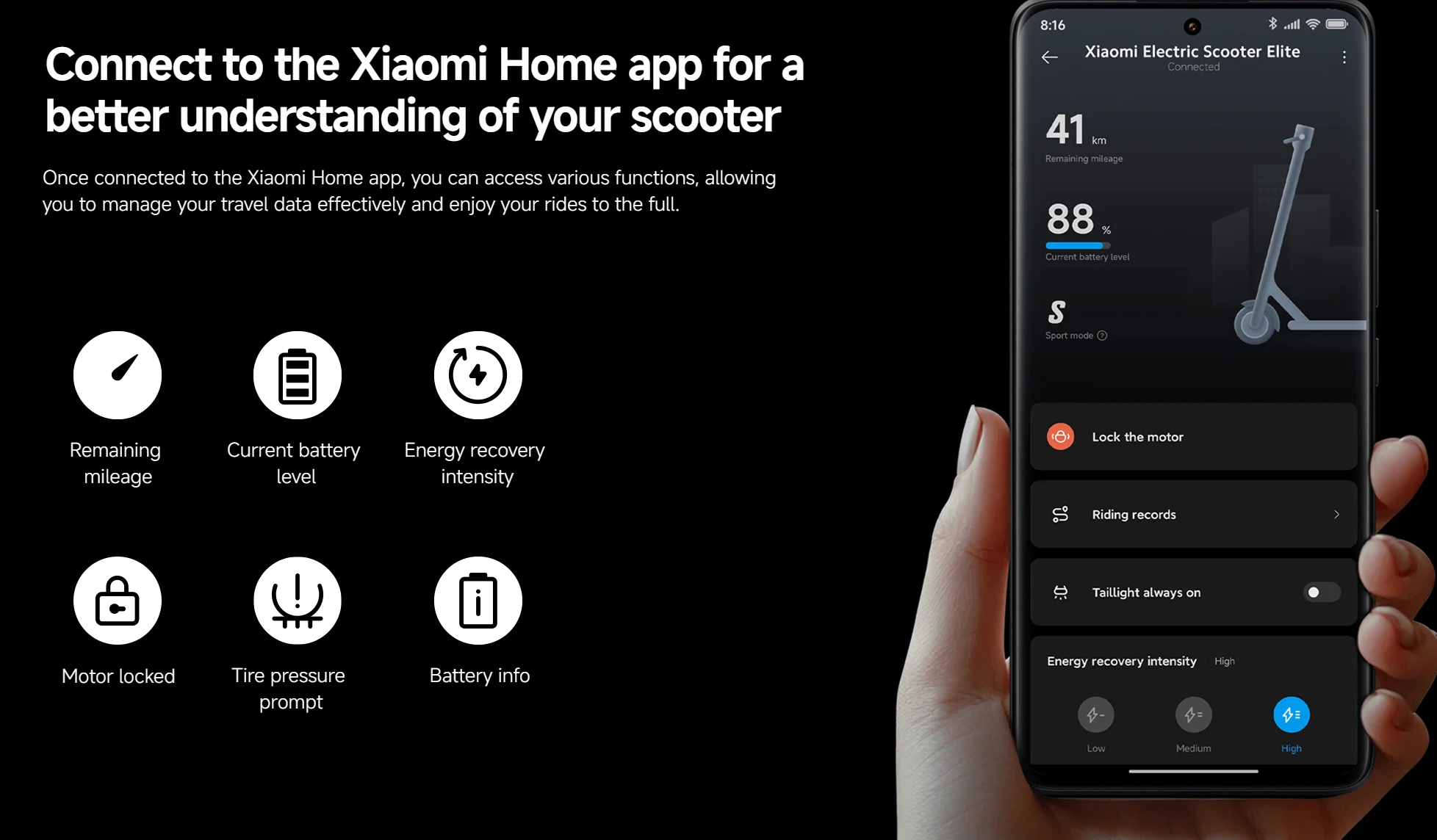 Z aplikacijo Xiaomi Home lahko spremljate preostali doseg, trenutno stanje baterije, intenzivnost rekuperacije energije in druge podatke. Dodatne funkcije, kot so opozorila za tlak v pnevmatikah ali zaklep motorja, vam omogočajo popoln nadzor nad skirojem. *Prva povezava z aplikacijo je potrebna za delovanje skiroja