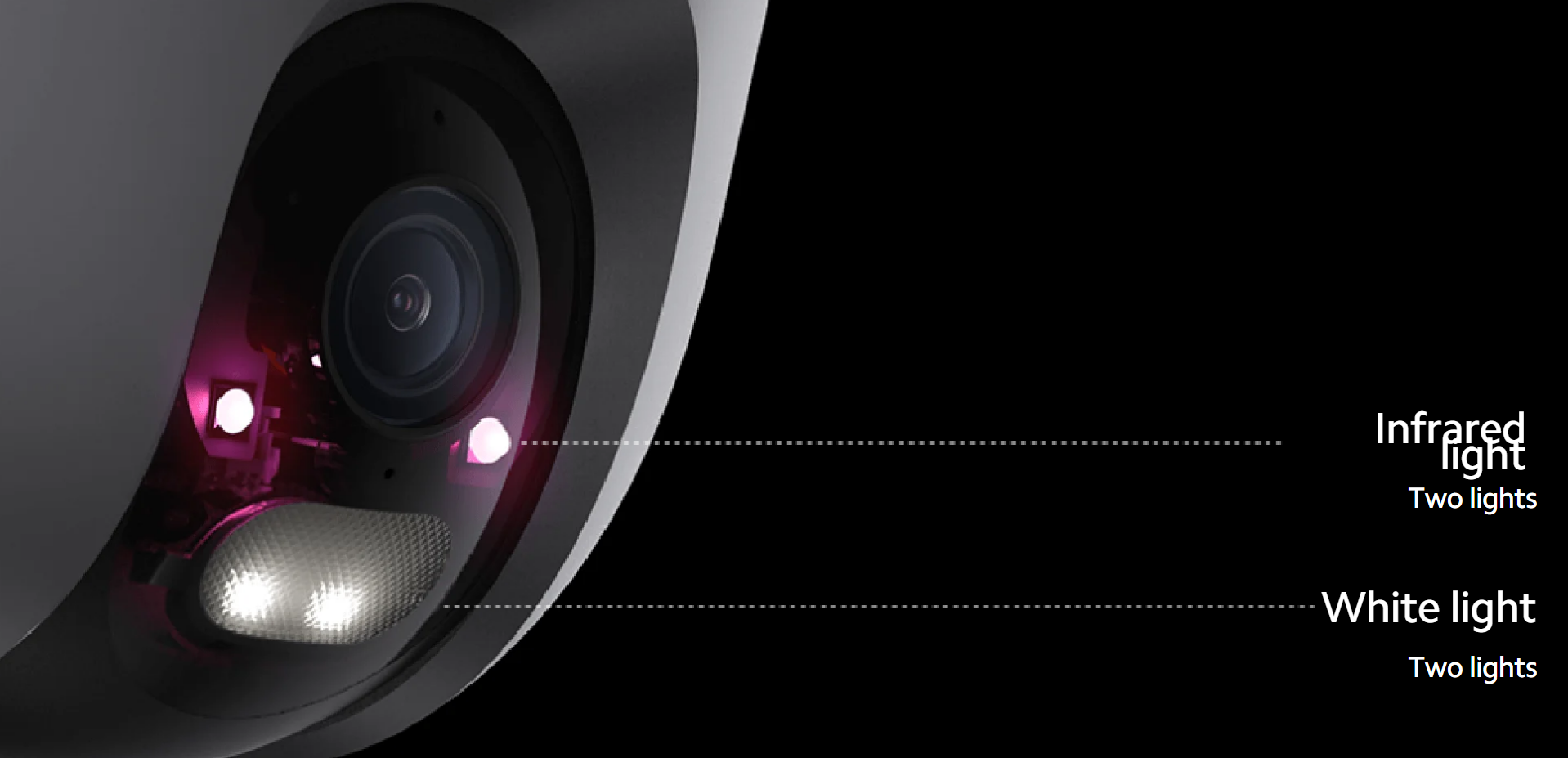 Kamera je opremljena z 2 vgrajenima visokozmogljivima belima lučkama in 2 infrardečima lučkama, zato lahko posname barvne slike tudi v najtemnejši noči. Visoko zmogljive bele luči se bodo samodejno vklopile, ko bodo zaznani človeški gibi za snemanje barvne slike.