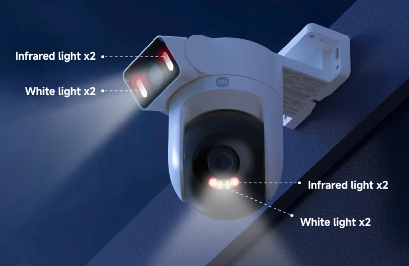 Vsaka kamera ima dve beli luči in dve infrardeči luči za nočno opazovanje. Ko kamere ponoči zaznajo človeško gibanje, se te dodatne luči samodejno vklopijo za zajemanje barvnih posnetkov.